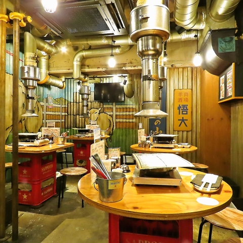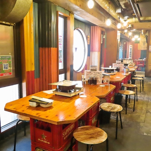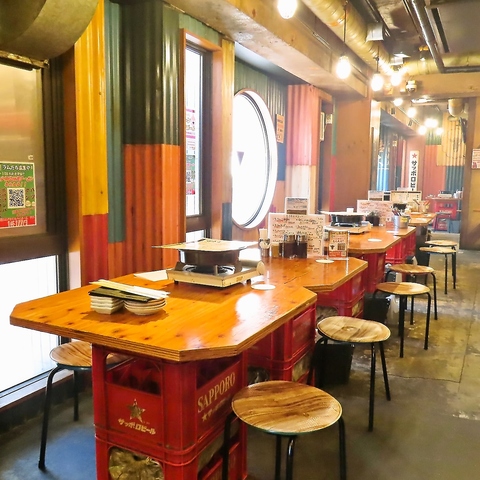 エイジング加工した壁に店内はモウモウと煙が立ち込め、庶民的な昭和の懐かしさ漂うワイルドな大衆酒場の雰囲気と肉が香ばしく焼ける匂いがたまりません!名物はジンギスカン盛り合わせ!一度食べたらジンギスカンのイメージが変わります!