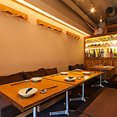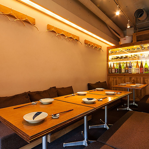 カウンターメインでの日替わりのアテとお酒が楽しめるお店♪日常から離れたひと時をお楽しみ下さい。2階の『隠れ家』的な大人の『和』の雰囲気とは裏腹に、カウンターを囲む座敷は絨毯バーを思わせるソファになっていて、リラックスしてお過ごしいただけます。