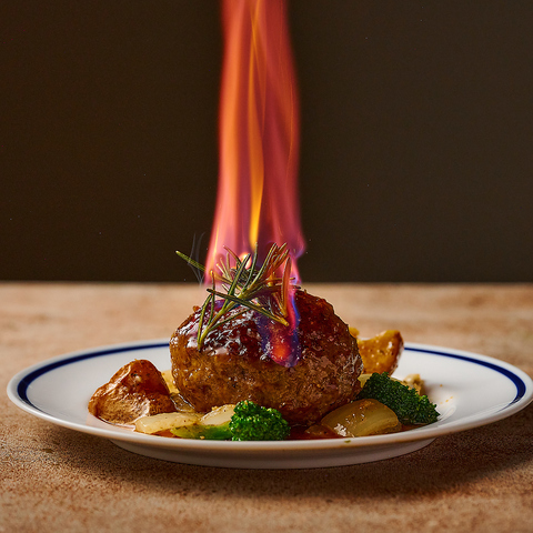 数多くのSNSやTVなどに取り上げられたKAMAKURAの中でも圧倒的人気を誇る、燃えるハンバーグはお客様の目の前で豪快に燃える演出と肉肉しい味わいが魅力となっております。デートや宴会利用のお客様にも燃えるハンバーグをお召し上がりいただけるコースをご用意しております。