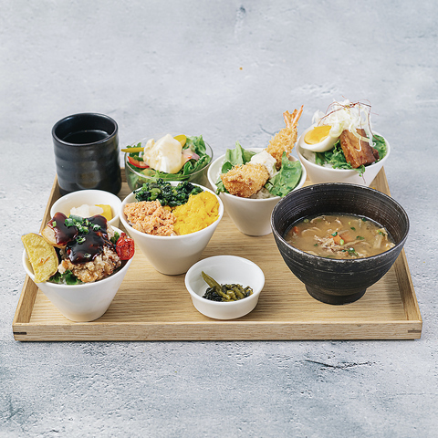 A set(丼+サラダ+豚汁+小鉢2種+ドリンク) 1680円/B set(丼+サラダ+豚汁+小鉢2種+ドリンク+タルトケーキ) 2060円(各税込)