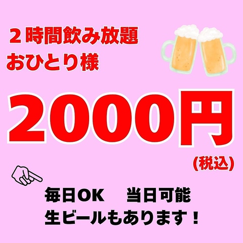 毎日OK☆当日可能!2時間飲み放題おひとり様2000円(税込)!!