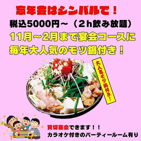 飲み放題+料理の宴会コースを5000円(税込)~ご用意しております!!11月~2月は毎年大人気のモツ鍋付きです☆貸切宴会可能なパーティールーム(予約のみ)、カラオケ(別料金)もご用意していますので、忘年会にもご利用ください♪