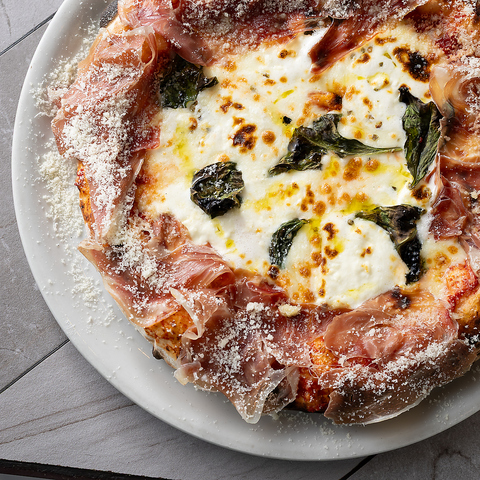 モッツァレラチーズ、自家製ストラッチャテッラ、生ハム、トマトソース、グリーンペッパー、バジル