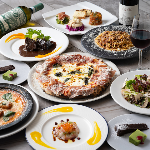 前菜3種、温菜、メイン、デザート付き◎鮮魚のカルパッチョや薪と石釜で焼いたローマピッツァ、トロトロに煮込んだ牛ホホ肉の赤ワイン煮込みとボリューム抜群♪デザートには自家製濃厚ティラミスが付いたコスパ最強コース!