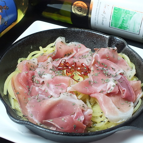 Trimはアヒージョが美味しいだけではありません。アヒージョの残りオイルで仕立てる、「生ハム〆パスタ」が大好評!!アヒージョを余すところなくお召し上がりいただけますよ♪