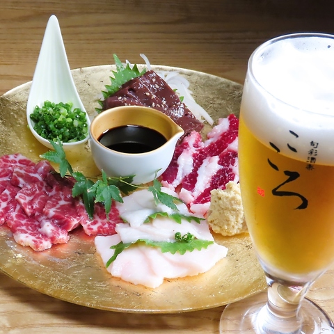 馬刺し好き必見!熊本名物、馬刺盛り合わせ。旬彩酒楽こころでは、料理人が厳選した霜降り馬刺し、馬ヒモ刺、数量限定のレバー刺など、鮮度抜群の馬肉を取り揃えております。さらに、辛子蓮根などの郷土料理との組み合わせで、熊本の味わいを存分に楽しめます。美味しいお肉を囲んで、特別なひとときを過ごしましょう。
