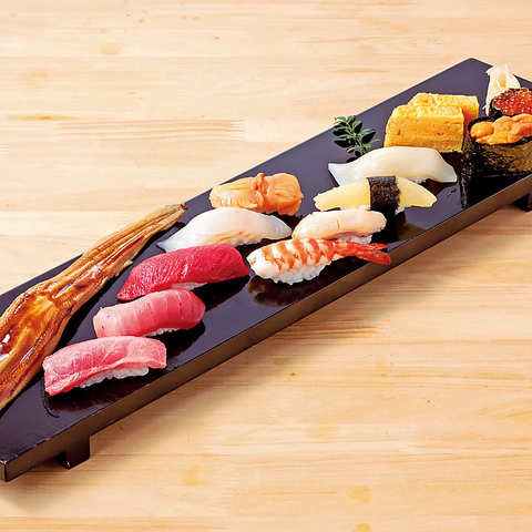 【握り12貫+つまみ玉子】◆生本鮪(大とろ・中とろ・赤身) ◆穴子1本握り ◆車海老 ◆平目 ◆赤貝 ◆うに ◆いくら ◆数の子 ◆旬のいか ◆あわび ※「板さん厳選握り」10貫盛り「特上」に、生本鮪大とろ・あわびを加えたものです。