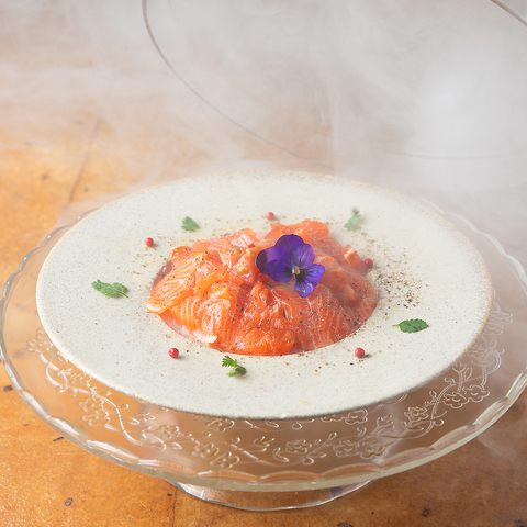 海鮮のカルパッチョを燻製で包んだオリジナルメニュー!蓋を開けた瞬間に燻製がふわっと広がります!見た目も楽しめる体験型メニュー♪盛り上がること間違いなしな一品です★
