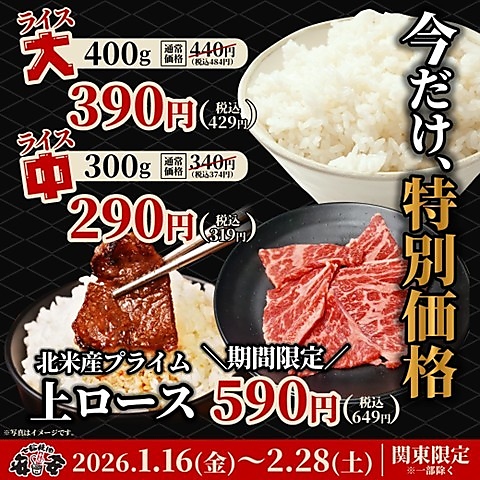 安安では今だけ、焼肉の原点とも言える“肉とご飯の黄金バランス”を本気の特別価格でご用意しました。まずは主役の肉。北米産プライムの【上ロース】。期間限定【590円(税込649円)】でご提供します。そして、満足度を決定づけるご飯。どちらも50円引き詳細はホームページでご確認ください