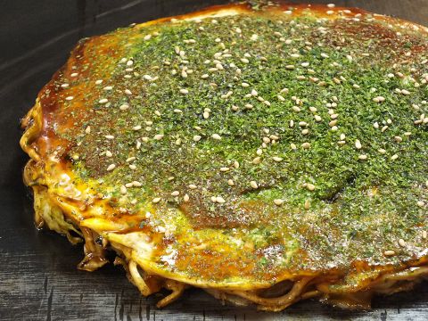 定番の広島お好み焼き・トッピングの王道、イカ天・ネギかけ・目玉のせと当店オリジナルのしそを加え、飽きのこない味を楽しんでいただけます。