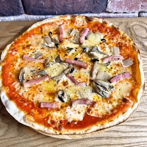 独自配合した生地を極限まで薄く伸ばして、250℃の窯オーブンでじっくりと焼き上げており、パリッとした食感が特徴のクリスピータイプのピザです。 トマトソース/4種のキノコ