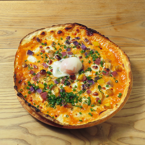 独自配合した生地を極限まで薄く伸ばして、250℃の窯オーブンでじっくりと焼き上げており、パリッとした食感が特徴のクリスピータイプのピザです。スカモルツァチーズ/モッツァレラ/温玉/じゃがいも/青ネギ/のり明太クリームソース