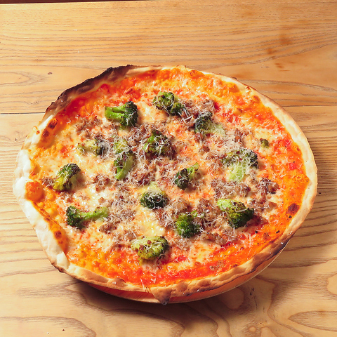 独自配合した生地を極限まで薄く伸ばして、250℃の窯オーブンでじっくりと焼き上げており、パリッとした食感が特徴のクリスピータイプのピザです。ペコリーノ ロマーノチーズ/モッツァレラ/香り豚のサルシッチャ/ブロッコリー/コショウ/トマトソース