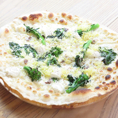独自配合した生地を極限まで薄く伸ばして、250℃の窯オーブンでじっくりと焼き上げており、パリッとした食感が特徴のクリスピータイプのピザです。リコッタチーズ/モッツァレラ/菜の花/レモンピール/アンチョビ/ハニーレモンドレッシング