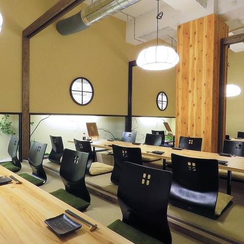 落ち着いた個室の和空間がお出迎え!2名様から個室席へご案内可能なので人数に合った快適な個室席へご案内致します!まるで秘密基地のような居心地の半個室もご用意!デートや急な飲み会にも最適です◎テーブル席もございます。掘りごたつのゆったりした癒し空間で美味しい料理をご堪能下さい!