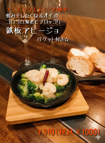 鷹の爪とにんにくにアンチョビを効かせた特製アヒージョ☆バゲット付きで¥910(税込¥1000)