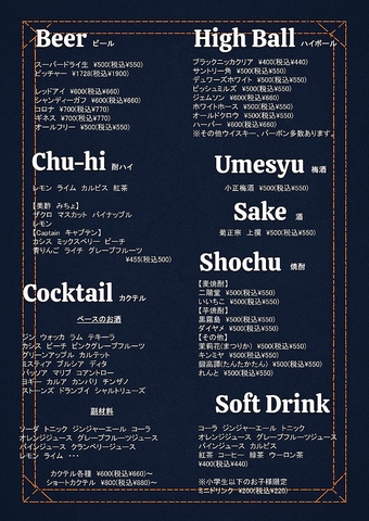 | 焼酎 | 二階堂(麦) 黒霧島(芋) 鍛高譚(しそ) れんと(黒糖) 残波(泡盛) などなど |