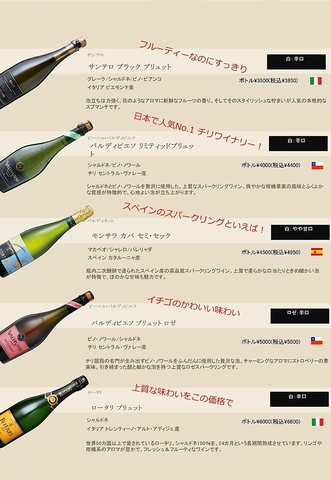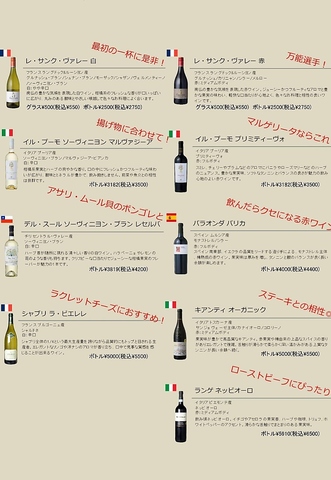 | ワイン | 赤、白、サングリア、ワインカクテル |