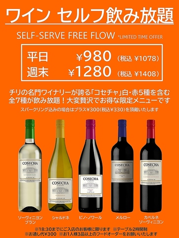 チリの名門ワイナリー【コセチャ】をメインに8種類以上のワインを好きなだけお召し上がりいただけます