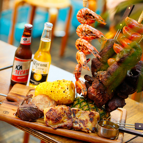手ぶらでご来店されてもBBQが楽しめる!!お客様自身でシュラスコとカットして楽しんで頂ける新スタイルとなっております♪牛肉は適度なサシが入って、柔らかさが特徴的な『ブラックアンガス牛』を使用!!他にも豚肉や鶏肉、野菜やパイナップルなど様々なシュラスコを楽しめます♪