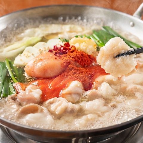 人気名物の明太もつ鍋は、ピリ辛の明太子とぷるぷるのもつが絶妙に絡み合う自慢の逸品!バターの香ばしい風味と、明太子の旨味がたまらない本格派の博多明太もつ鍋を是非ご堪能ください!