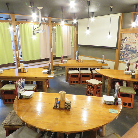 多様なスタイルでお客様をお迎えいたします。カウンター・テーブル・掘りごたつと人数やシチュエーションに合わせてご利用下さい。アットホームな雰囲気で居心地も◎土間の半円テーブルは、酒の仕込み樽を特注した物です。また一段高くなったカウンター席に座ると、そこでしか頼めないお得な串コースもあり、スタッフとの会話も楽しめます♪