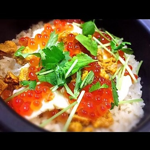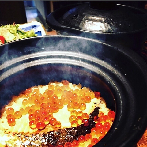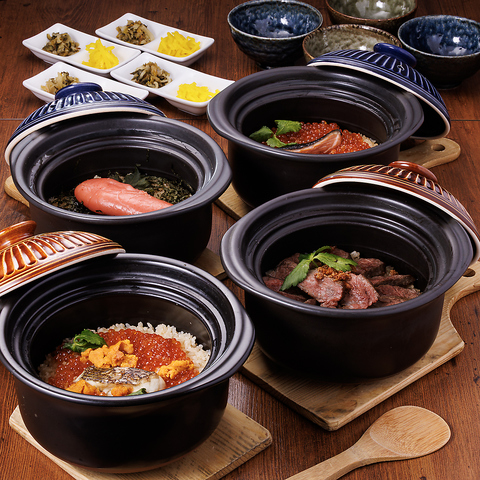 当店に来たらぜひ味わっていただきたいのが、自慢の土鍋ごはんです。ご注文をいただいてから一台ずつ丁寧に炊き上げるので、炊きたて熱々の美味しさをお楽しみいただけます◎鯛・ウニ・イクラがキラキラ輝く宝石箱や、定番人気の「鮭とイクラ」など、種類豊富にご用意しています!