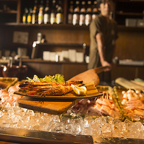 大人気のカウンター席は目の前にずらりと並んだ厳選素材を選べる特等席♪新鮮な食材を目の前に、385円(税込)均一とは思えない料理をお楽しみいただけます◎デートの話題にも困らないかも!!【炉端 個室 飲み放題 居酒屋 ろばた あぶりやき ハルカス 力丸 天王寺 阿倍野 てんしば】