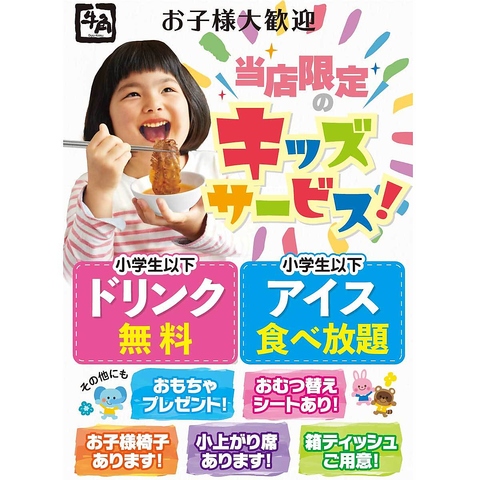 当店のお子様サービス!【小学生未満ドリンク無料!】【小学生未満アイス食べ放題!】「おむつ替えシート」「お子様用イス」「箱ティッシュ」「小上がり席」キッズ会員になると小学生までドリンク、アイスが無料に!しかも会員になって誕生月にご利用頂くと、素敵なプレゼントがまってます!