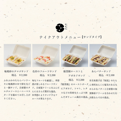 テイクアウトメニュー【サンドタイプ】は4種ございます。ご自宅でふわふわのパンケーキをお召し上がりくださいませ。