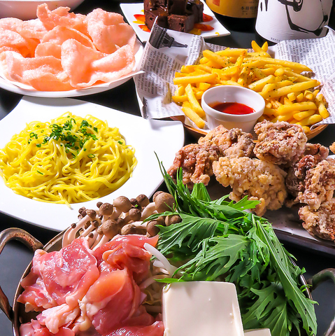 枝豆ガーリックバター醤油、本日の厳選サラダ、フライドポテト、唐揚げタルタルにメインが選べる!A 鉄板焼き(鶏)、B 鶏鍋(〆は雑炊orラーメン)、C お刺身の盛り合わせ4種から選べてデザート付!!なんとエクストラコールドも飲み放題!!