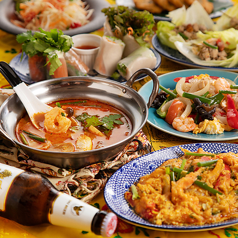 日本初の自家製小麦粉生麺パッタイは注文率90%越え!海老の生春巻きから始まるコースは名物トムヤムクンスープなどエスニック料理の王道料理を満喫できるプラン!メインは牛ハラミのステーキと鶏もも肉のグリルの2種類を堪能!お食事はタイのソウルフード、パッタイをオリジナルもちもち生麺で。