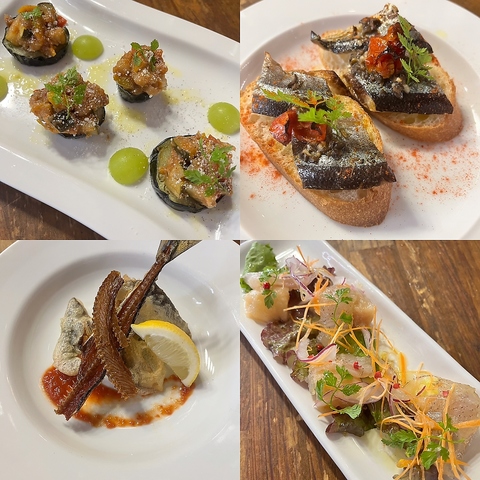 白身魚のカルパッチョ 自家製ハム キッシュ 合鴨のスモークなど10種類以上のメニューが500円で楽しめます。お一人様でも丁度よくみんなでいろいろたべるもよし。