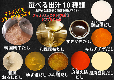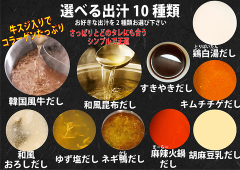 和風昆布出汁、韓国牛出汁、麻辣火鍋出汁、鶏白湯出汁、胡麻豆乳出汁、すき焼き出汁、ゆず塩出汁、キムチチゲ出汁、和風おろし出汁、ネギ鴨出汁