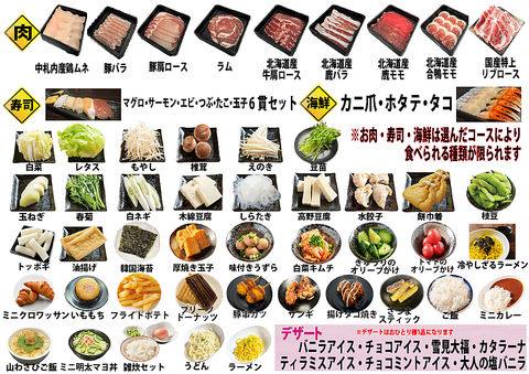 お野菜やアラカルトは合わせて40種類以上の超充実メニューが全て食べ放題。〆のラーメンうどんは十勝産や北海道産小麦を100%使用した製麺所から取り寄せています。〆もオススメです。