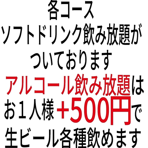 ソフトドリンク飲み放題込み・アルコール(お1人様+500円)追加料金で生ビール含め21種類が飲み放題