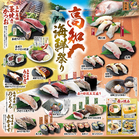 3/3より、高知県の海鮮や特産物、さらに春に旬を迎えるネタが大集合!寿司とサイドメニュー合わせて全23品が登場します。高知県野見湾で腕利きの生産者が愛情を注ぎ育てた「黒潮真鯛」は、鮮やかな桜色で旨味もたっぷりです!また、程よく脂がのった高知名物「藁焼きかつお」も登場!