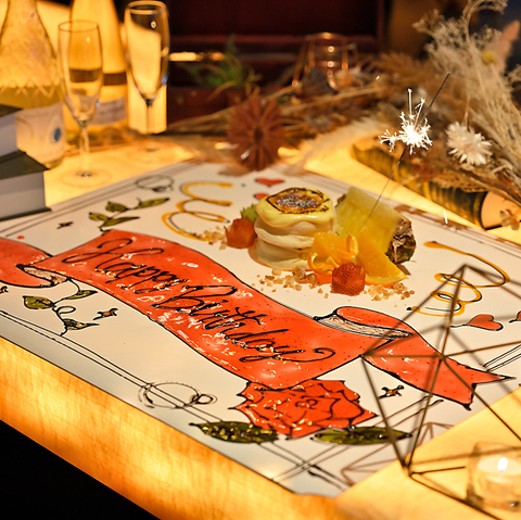 要前日予約でメッセージ入り特製テーブルアートをご用意致します。完全個室で大切な方との記念日や誕生日、合コンなどに◎!その他サプライズ等もご気軽にご相談ください。