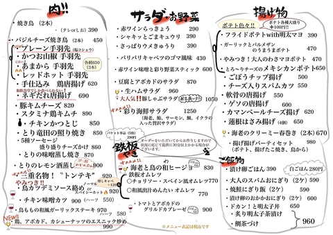 がっつり楽しみたい方におすすめの肉料理やシェアにもぴったりな揚げ物や鉄板やきなど様々なラインナップのメニューをご提供いたします☆