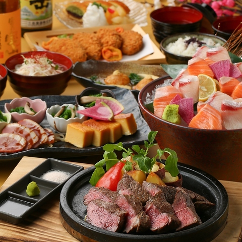 人気の『山吹コース』国産牛サーロインを贅沢に使用し、鉄板で丁寧に焼き上げて提供いたします。他にもお造りや和牛ローストビーフ、牛カルビご飯など豪華食材を取り揃えました。和空間個室で『牛若丸』でのお食事をごゆっくりとお楽しみ下さい。食材やお部屋のご相談などもお気軽に◎ご宴会に人気のコースです。