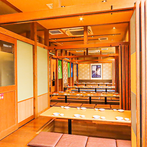 【貸切OK!広々掘りごたつ個室】開放感溢れる掘りごたつ個室も完備しております。貸切は50名様~114名様までご利用可能なので、忘年会・新年会・同窓会等の各種宴会に是非ご利用ください。宴会にピッタリの「横断幕」or「寄せ書き焼酎ボトル」特典付きプレミアムコースもご用意しております!