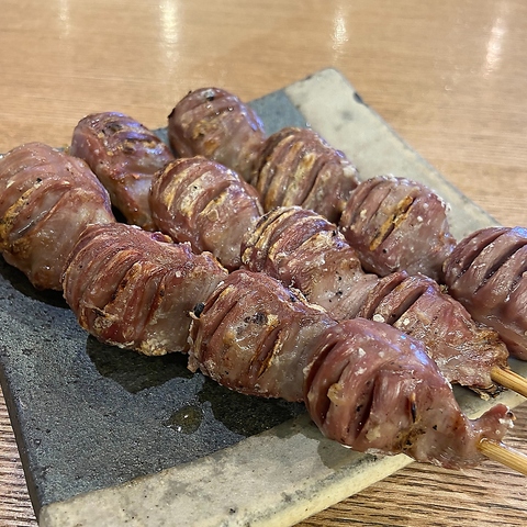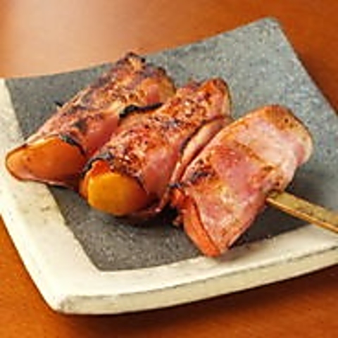豚バラで巻いた特殊な串もの。ピーマンの中にチーズが入った豚巻きです。アツアツのとろけるチーズとピーマンのシャキシャキした食感が絶妙のハーモニーを奏でる、お店イチオシの一品。カウンターのお席は目の前で焼き上げるため、良い香りがさらに食欲をよそります・・♪