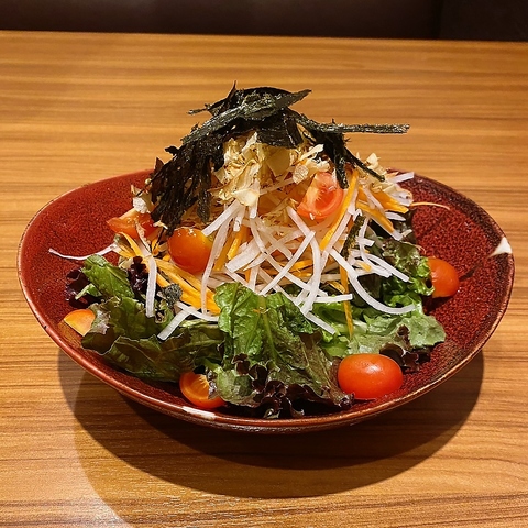 いち善の和風サラダは、旬の野菜がふんだんに使われた彩り豊かな一品です。シャキシャキの大根や、甘みのあるミニトマトが鮮やかに盛り付けられ、見た目にも楽しい。さっぱりとした味わいは、焼肉の合間の箸休めとしても最適です。使用する野菜に合わせたドレッシングが、素材の旨味を引き立て、リフレッシュ感を与えてくれます。