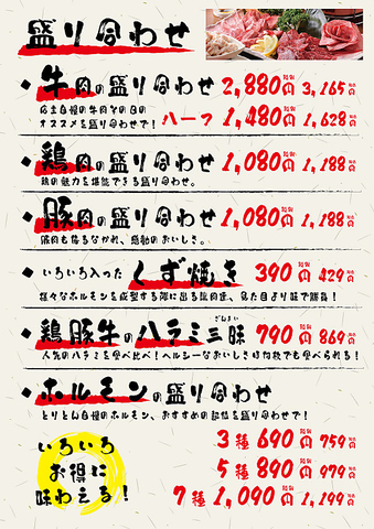 牛・豚・鶏・ホルモン 各種盛り合わせあります。いろいろ食べ比べされたい方にはオススメです!!とりとんのスタンプカードが全て貯まると牛肉の盛り合わせが貰えちゃいます☆