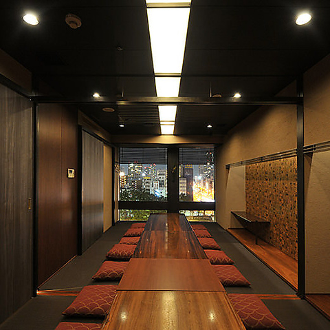 最大16名様までの掘りごたつ個室。お部屋にある窓から大川の夜景を眺めながらお食事いただけます。