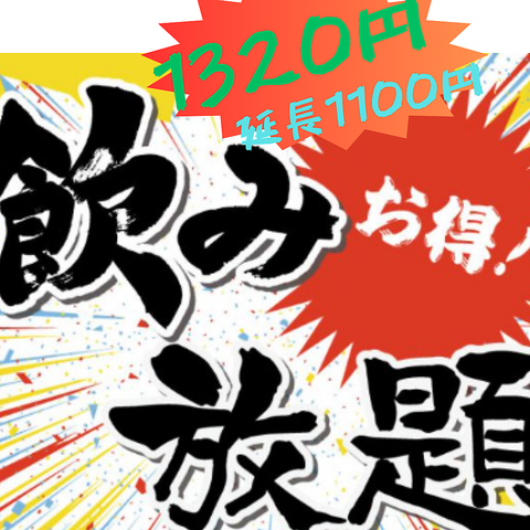 最初1時間のみ、お通し代とお一人様2品以上ご注文いただきます。その後は1時間毎の延長で¥1100円加算されます。1時間で、クリアアサヒ(生)、ハイボール、芋・麦・米・そばの各焼酎、日本酒、サワー、カクテル、ワイン、果実酒、ソフトドリンクなどが飲み放題。スーパードライに変更も可能です。