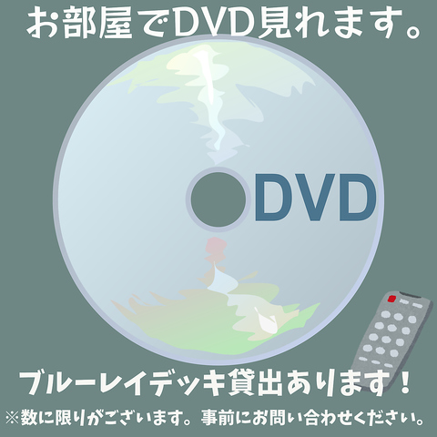 DVDデッキ貸出ございます!お好きなDVDをご持参し、ルーム内のスピーカーとモニターから迫力のある映像と音でお楽しみいただけます。※数に限りがございます。事前にお問い合わせください。