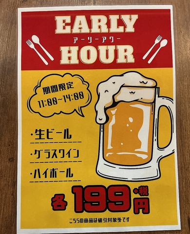 14時までは生ビール・グラスワイン・ハイボールを199円(税抜)で、更にお得にお楽しみ頂けます♪