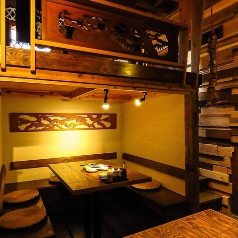 【ロフト座敷席:4名様×1卓】プライベート感たっぷり!落ち着いた空間でゆったりと。店内のロフト部分にある座敷席は、4名様までご利用いただけるプライベート感たっぷりのお席。落ち着いた照明と木の温もりに包まれた空間で、周囲を気にせずお過ごしいただけます。女子会や少人数での飲み会におすすめです。