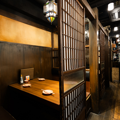 木の格子や土壁風の素朴な内装が、どこか懐かしい和の空間を演出しています。間接照明の温かい光がゆったりとくつろげます。気の置けない仲間との食事や、落ち着いて語らいたいデートにも最適!